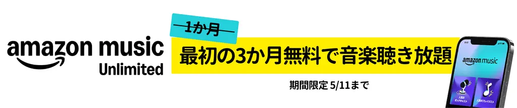 • 【5/11まで】Amazon Music Unlimited 最初の3か月無料で音楽聞き放題