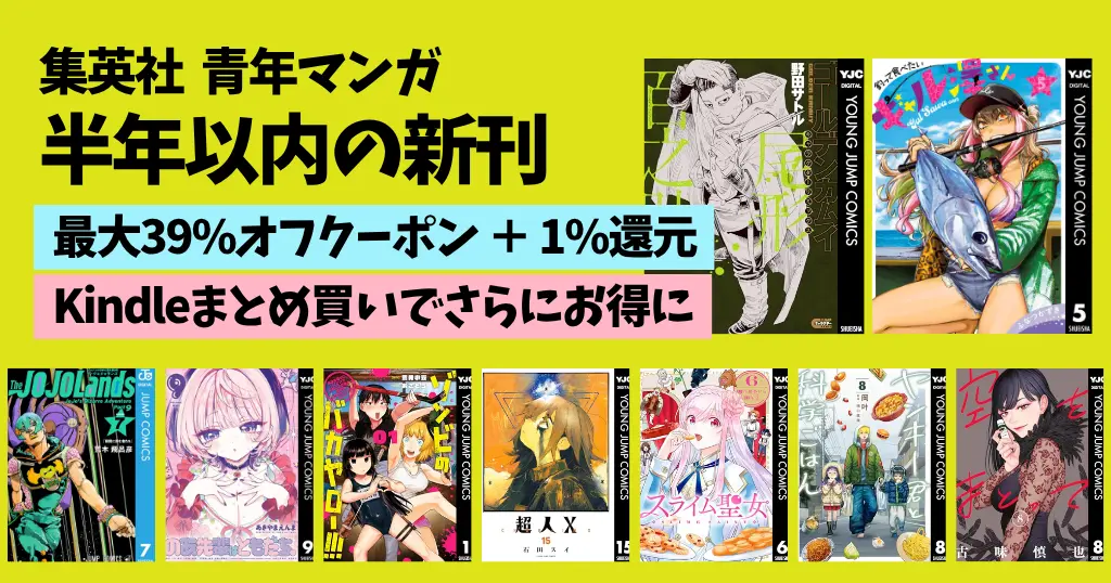 Kindleストアで、「集英社の青年マンガ(主にヤングジャンプ作品)」が、最大39%オフクーポンセールを開催中。